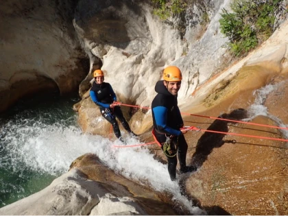 Canyoning enfant : en général, les enfants peuvent participer au canyoning à partir de 8 ans, à condition de choisir des parcours adaptés à leur âge et à leur niveau de compétence. Les parcours familiaux et les itinéraires pour débutants sont spécialement conçus pour garantir une expérience amusante et sécurisée pour les plus jeunes. Dans les parcours de canyoning adaptés aux enfants les sauts peuvent être évités s'ils ne se sentent pas prêts, et il est possible d'opter pour des randonnées aquatiques sans rappel où il n'y a pas d'utilisation de corde. Assurez-vous également de sélectionner un canyon où la marche d'approche est courte et accessible, afin de garantir une expérience agréable pour toute la famille.
