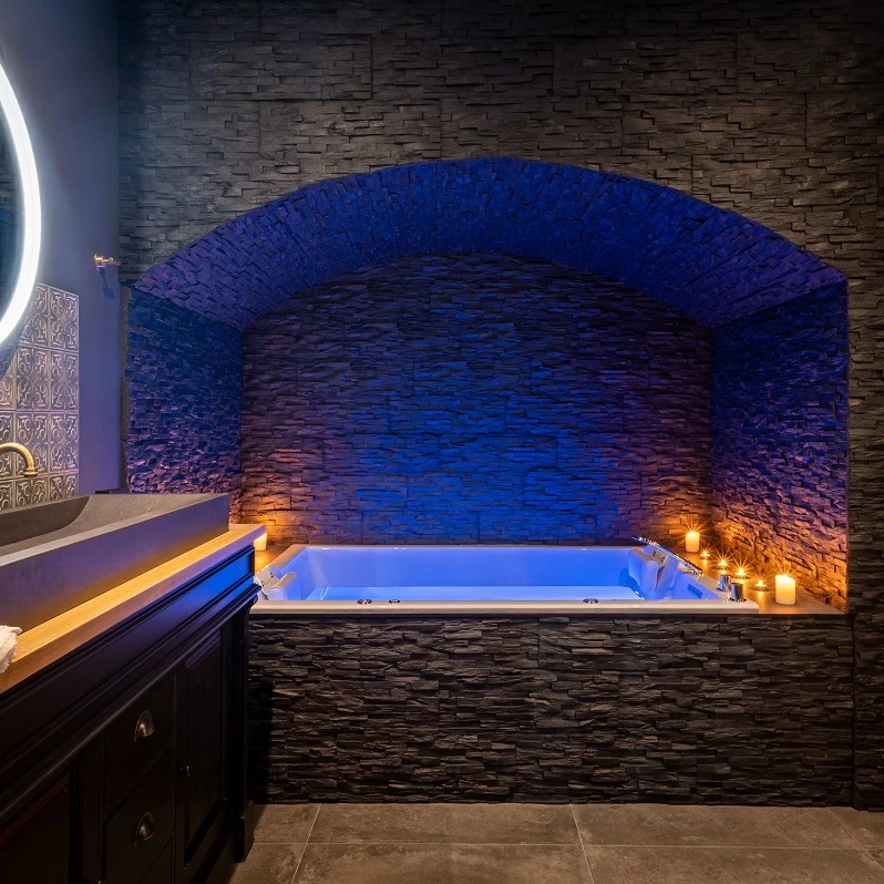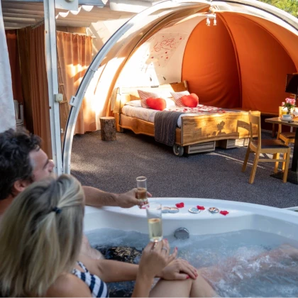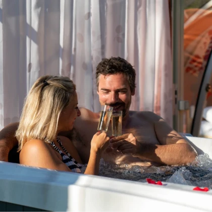 - Une baignoire balnéo à ciel ouvert : détente et relaxation garanties, avec une vue imprenable sur les étoiles.