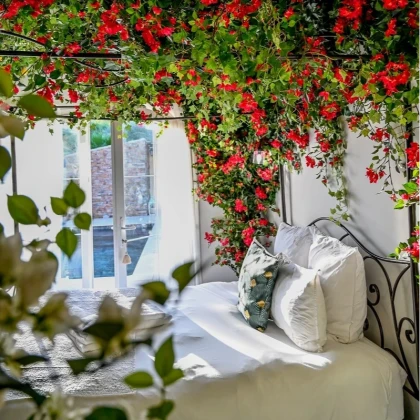 La bastide propose plusieurs suites au style unique : moderne et chic ou complètement dépaysante, inspirée par la vigne et dotée d’un lit à baldaquin. Cette escapade est idéale pour se retrouver, prendre le temps de savourer chaque instant, se reposer et profiter d’un jacuzzi dans une maison provençale au cœur de la Côte d’Azur.